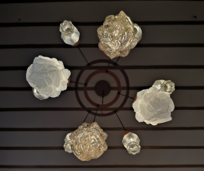El candil se convierte en una pieza de observación y toma un papel protagónico en el conjunto, la luz distorsionada por la forma de las piezas de vidrio aporta textura y movimiento al espacio.