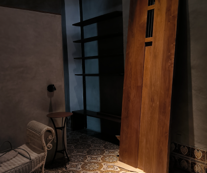 El proyecto está inmerso en el centro histórico de la ciudad de Mérida, y busca ser un oasis de confort ante la vida ajetreada de la zona, por ello la iluminación debe complementar esta intención del diseñador, pensamos en una luz sensual, confortable y cálida,  por lo que utilizamos luces de acento atenuables, en este proyecto los diseñador nos plantean el desafío de crear un candil a partir de piezas sobrevivientes de un antiguo candil, el exitoso candil es el resultado de la experimentación por medio de diferentes herramientas y también del resultado de la colaboración.